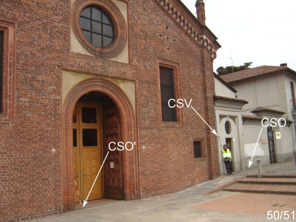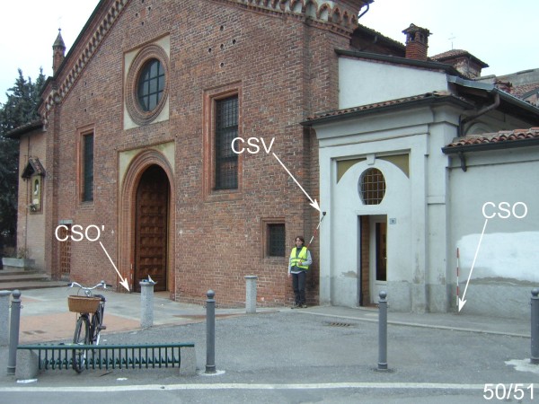[{"simbolo_contrassegno":"P5","materializzazione":"(CSO) – Pozzetto interrato nell'angolo formato dal muro di cinta ed il pilastro destro della facciata della casa adiacentre alla Chiesa."},{"simbolo_contrassegno":"B5","materializzazione":"(CSO') – Disco metallico del Catasto infisso sulla soglia del portone d'accesso alla Chiesa. (Misurabile con mezza sfera)."},{"simbolo_contrassegno":"V1","materializzazione":"(CSV) – Mensola infissa sul pilastro sinistro della casa suddetta al numero civico 10."}]