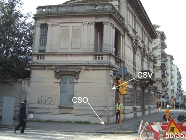 [{"simbolo_contrassegno":"P3","materializzazione":"(CSO) – Chiusino in ghisa, interrato alla base della facciata sinistra dell'abitazione, in prossimit\u00e0 dello spigolo destro. Rialzato con tubo in PVC e coperchio in ghisa. (\"A\" non misurabile)"},{"simbolo_contrassegno":"V1","materializzazione":"(CSV) – Mensola infissa sulla facciata principale, in prossimit\u00e0 dello spigolo sinistro."}]