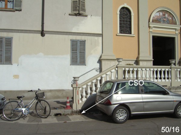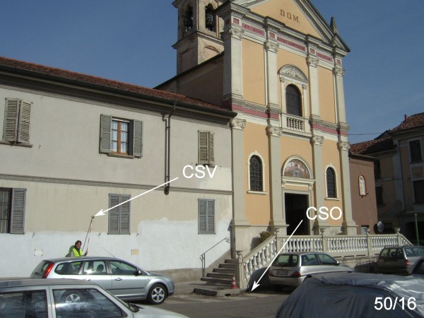 [{"simbolo_contrassegno":"P5","materializzazione":"(CSO) – Pozzetto rialzato e protetto con tubo in PVC e coperchio in ghisa, posto all'estremit\u00e0 sinistra del muro che sostiene la rampa sinistra delle scale d'accesso alla Chiesa."},{"simbolo_contrassegno":"V1","materializzazione":"(CSV) – Mensola infissa sulla facciata della casa a sinistra della Chiesa, dopo la seconda finestra verso sinistra.( Nel 2006 la mensola risulta spostata e rimaterializzata.)"}]