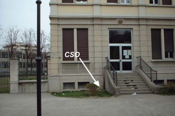 [{"simbolo_contrassegno":"P3","materializzazione":"(CSO) – Chiusino in ghisa, cementato alla base della facciata presso l'estremit\u00e0 sinistra dell'angolo formato con la rampa delle scale della scuola elementare."},{"simbolo_contrassegno":"V1","materializzazione":"(CSV) – Mensola infissa sulla facciata in corrispondenza del cso, nei pressi dello spigolo sx."}]
