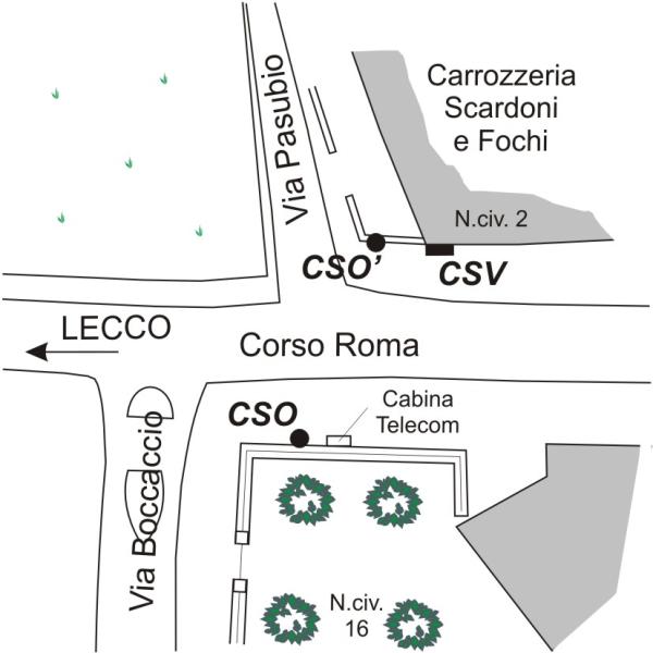[{"simbolo_contrassegno":"B1","materializzazione":"(CSO) – Bullone infisso sul muro di cinta del giardino del condominio al N\u00b0 civ.16 di Via Boccaccio in prossimit\u00e0 dell'a cabinaTelecom su Corso Roma."},{"simbolo_contrassegno":"B2","materializzazione":"(CSO') – Chiodo anonimo (cilindretto sporgente) fissato sulla copertura del muro di cinta della carrozzeria prospiciente C.so Roma con l'incrocio con Via Pasubio.(EX Cs. 75' e corrisponde al Cs.55 del Catasto)."},{"simbolo_contrassegno":"V4","materializzazione":"(CSV) – Piastrina del Catasto infissa in prossimit\u00e0 dello spigolo sinistro dello stesso edificio su Corso Roma, nei pressi del cso'. (EX Cs. 75' e corrisponde al Cs.55 del Catasto)."}]