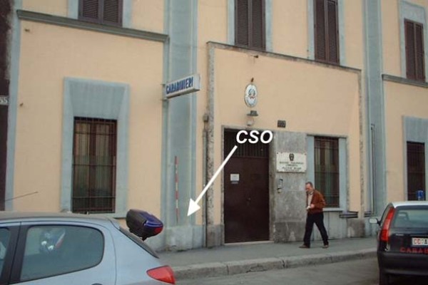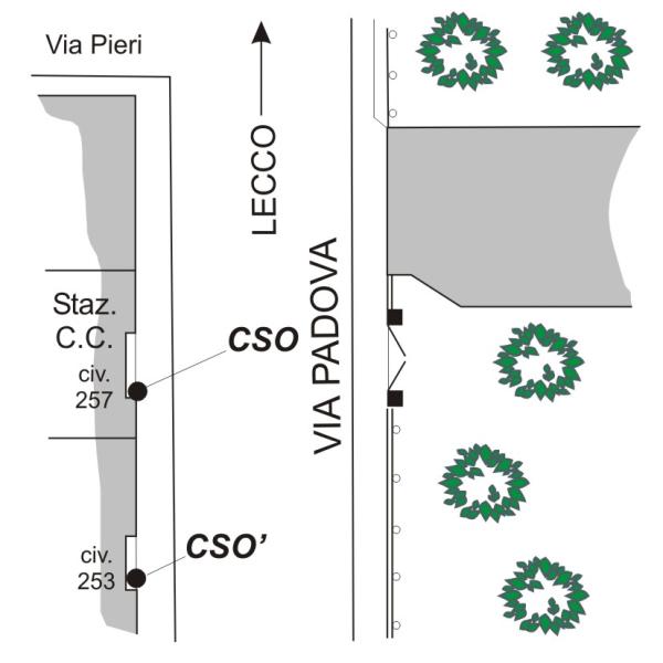 [{"simbolo_contrassegno":"B2","materializzazione":"(CSO) – Chiodo anonimo infisso sullo zoccolo alla base di una rientranza semicilindrica sulla facciata della Stazione C.C., a sinistra della porta."},{"simbolo_contrassegno":"B3","materializzazione":"(CSO) – Cerchio inciso del Catasto (1972) sulla soglia del civico n,253, a sinistra entrando (cs n. 299)."}]