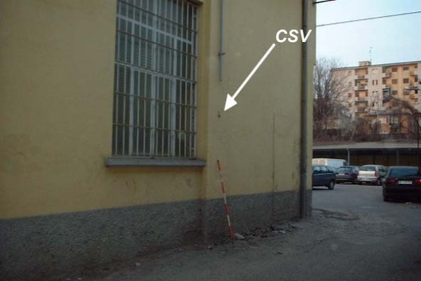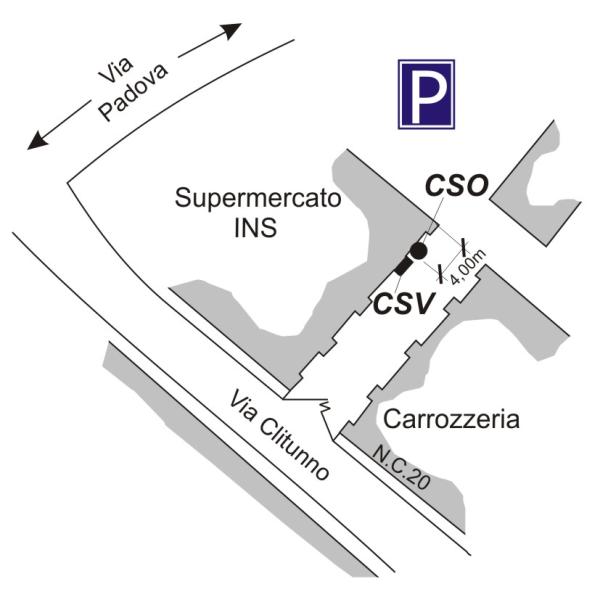 [{"simbolo_contrassegno":"P3","materializzazione":"(CSO) – Chiusino in ghisa, posto alla base della parete sinistra del vicolo di accesso al parcheggio del supermercato, a 4 m. dallo spigolo, protetto da chiusino anonimo in ghisa."},{"simbolo_contrassegno":"V1","materializzazione":"(CSV) – Mensola infissa sulla lesena in corrispondenza del cso."}]