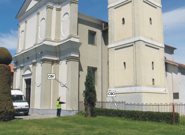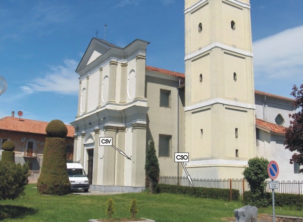 [{"simbolo_contrassegno":"P2","materializzazione":"(CSO) – Chiusino in ghisa di II\u00b0 categoria stabilizzato alla base del campanile."},{"simbolo_contrassegno":"V1","materializzazione":"(CSV) – Mensola infissa sulla facciata della chiesa, spigolo di destra."}]