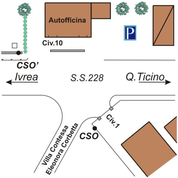 | Contrassegni | [{"simbolo_contrassegno":"B2","materializzazione":"(CSO) – Chiodo anonimo infisso sulla sommit\u00e0 del cordolo a destra della strada in direzione Ivr\u00e8a, in corrispondenza del tombino dell'Enel."},{"simbolo_contrassegno":"B1","materializzazione":"(CSO') – Bullone infisso nel muretto perimetrale di un'azienda di legnami, lato su via E.Corbetta, a destra dell'accesso al civico N\u00b01. La stadia non raggiunge la verticalit\u00e0."}] |