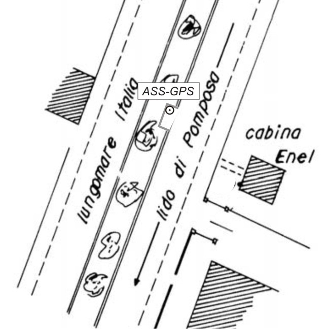 | materializzazione | Centrino GPS di altro ente posto nella rientranza della aiuola spartitraffico di fronte ad una cabina Enel posta nei pressi del civico 119 del lungomare Italia. |