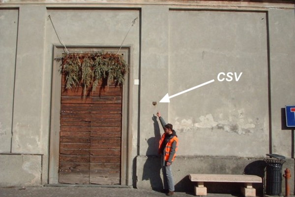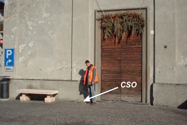 [{"simbolo_contrassegno":"P5","materializzazione":"(CSO) – Pozzetto, protetto da tubo in pvc e tappo in ghisa, posto alla base della facciata dell'ex chiesa parrocchiale, a sinistra della porta sul marciapiede all'angolo tra via Roma e via S. Biagio."},{"simbolo_contrassegno":"V1","materializzazione":"(CSV) – Mensola infissa sulla lesena di destra della porta della suddetta chiesa."}]