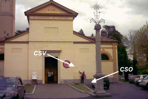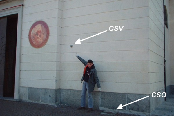[{"simbolo_contrassegno":"P3","materializzazione":"(CSO) – Chiusino in ghisa posto alla base della facciata, a destra della porta, e presso lo spigolo destro della chiesa."},{"simbolo_contrassegno":"V1","materializzazione":"(CSV) – Mensola infissa sulla stessa facciata, tra la porta e il CSO."}]