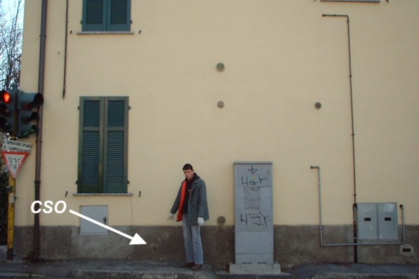 [{"simbolo_contrassegno":"B1","materializzazione":"(CSO) – Bullone infisso sulla facciata laterale della residenza al n.c. 84 di via Brianza, presso lo spigolo sinistro vicino alla finestra d'angolo del lato prospiciente via Monte Bolettone."}]