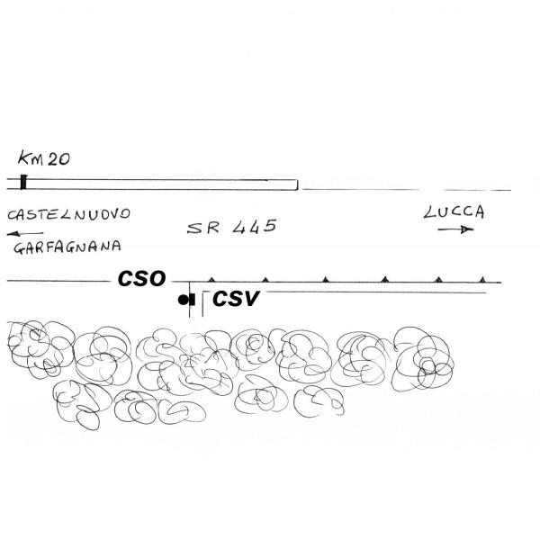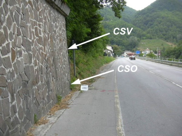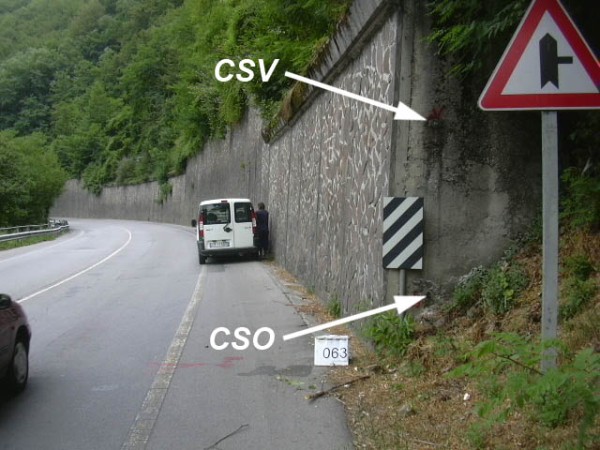 | Contrassegni | [{"simbolo_contrassegno":"B1","materializzazione":"(CSO) – Bullone infisso sul muro di sostegno a monte, sul lato perpendicolare alla strada"},{"simbolo_contrassegno":"V6","materializzazione":"(CSV) – Piastrina con cilindretto infissa sul muro in corrispondenza del CSO"}] |
