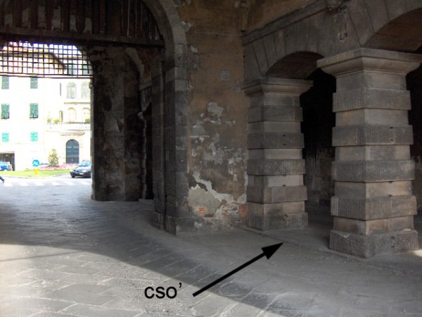 | Contrassegni | [{"simbolo_contrassegno":"B1","materializzazione":"(CSO) – Bullone infisso sulla parete laterale destra uscendo dalla citt\u00e0 a 20 cm. dall'angolo destro."},{"simbolo_contrassegno":"B3","materializzazione":"(CSO') – Cerchio inciso sul selciato sotto l'atrio del voltone di sinistra uscendo dalla citt\u00e0, oltre il pilastro centrale a 0,23 m. dal suddetto e a 3,60 m. dalla parete laterale sinistra."}] |