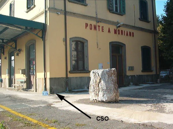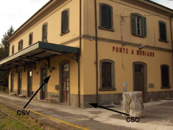 [{"simbolo_contrassegno":"B1","materializzazione":"(CSO) – Bullone murato sul fianco destro del fabbricato viaggiatori, presso lo spigolo"},{"simbolo_contrassegno":"V3","materializzazione":"(CSV) – Piastrina antica sulla facciata della stazione presso la sinistra della prima porta di destra del fabbricato viaggiatori"},{"simbolo_contrassegno":"V5","materializzazione":"(CSV') – Targa con linea incisa, indicante livello sul mare m 44,34, presso l'asse fabbricato viaggiatori"}]