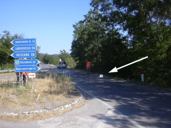 [{"simbolo_contrassegno":"B1","materializzazione":"(CSO) – Bullone tipo CNR cementato sul tombino al bivio per la SP 19 di Montioni."}]