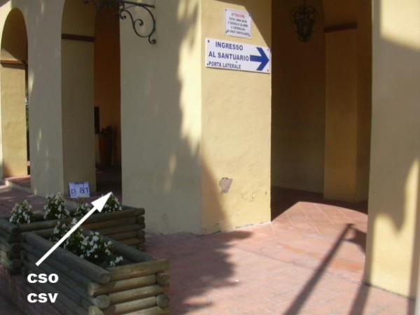 [{"simbolo_contrassegno":"B1","materializzazione":"(CSO) – Bullone tipo IGM cementato sullo spigolo dx rispetto all'ingresso del santuario."},{"simbolo_contrassegno":"V2","materializzazione":"(CSV) – Piastrina a barilotto cementata a dx della porta d'ingresso del santuario."}]