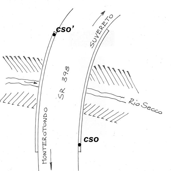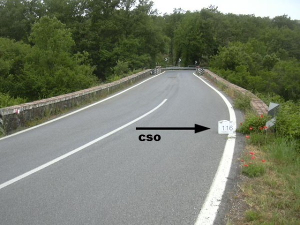 | Contrassegni | [{"simbolo_contrassegno":"B7","materializzazione":"(CSO) – Centrino inox (Vertice Tecnico Regionale) cementato su spalletta del ponte al margine dx a valle."},{"simbolo_contrassegno":"B2","materializzazione":"(CSO') – Chiodo anonimo tipo CNR cementato su sommit\u00e0 spalletta del ponte al margine sx a monte."}] |