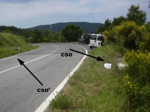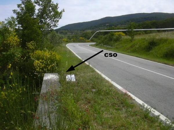 | Contrassegni | [{"simbolo_contrassegno":"B4","materializzazione":"(CSO) – Centrino universale cementato sulla spalletta a dx della strada."},{"simbolo_contrassegno":"B2","materializzazione":"(CSO') – Chiodo anonimo tipo CNR cementato sul cordolo del tombino a lato opposto."}] |