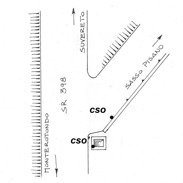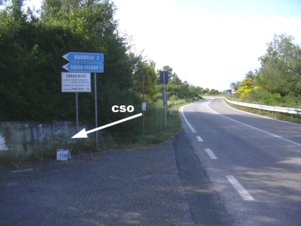 [{"simbolo_contrassegno":"B1","materializzazione":"(CSO) – Bullone tipo IGM cementato sul muro di sostegno nei pressi di bivio."},{"simbolo_contrassegno":"B2","materializzazione":"(CSO') – Chiodo anonimo tipo CNR cementato sul cordolo di tombino scorriacque nei pressi di CSO."}]