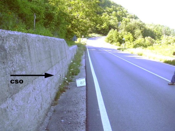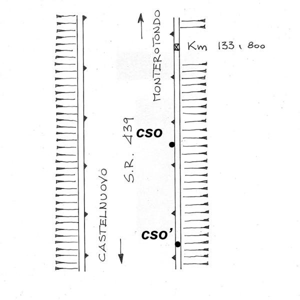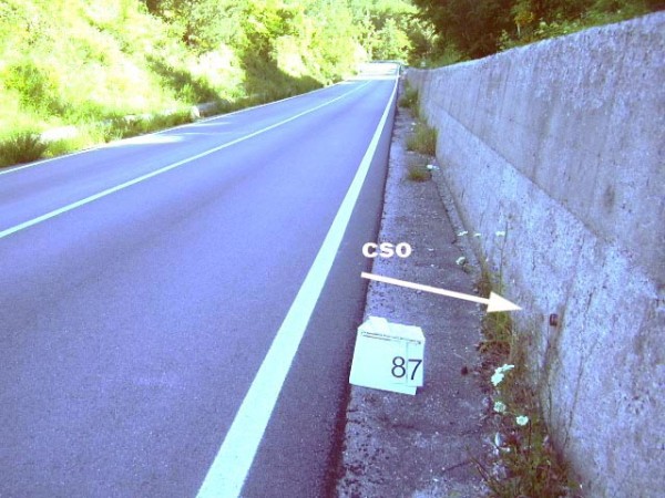 [{"simbolo_contrassegno":"B1","materializzazione":"(CSO) – Bullone tipo IGM infisso sul muro di sostegno al km 133,750."},{"simbolo_contrassegno":"B2","materializzazione":"(CSO') – Chiodo anonimo tipo CNR cementato sulla sommit\u00e0 del medesimo muro circa 15m. prima del CSO"}]