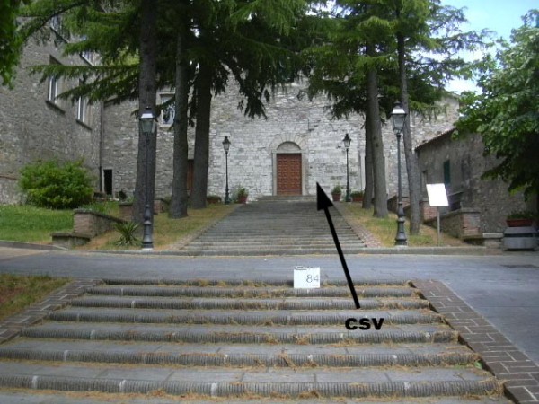 [{"simbolo_contrassegno":"B1","materializzazione":"(CSO) – Bullone tipo IGM cementato su muro disotegno in pietra a sx della scalinata che conduce alla chiesa."},{"simbolo_contrassegno":"V2","materializzazione":"(CSV) – Piastrina a barilotto posta a dx dell'ingresso della chiesa."}]