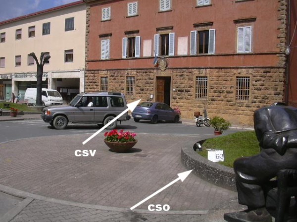 [{"simbolo_contrassegno":"B2","materializzazione":"(CSO) – Chiodo anonimo tipo CNR murato sul muretto dell'aiuola alla base della torre circolare."},{"simbolo_contrassegno":"V2","materializzazione":"(CSV) – Mensola murata sull'edificio del municipio di Pomarance a sx della porta d'ingresso."}]