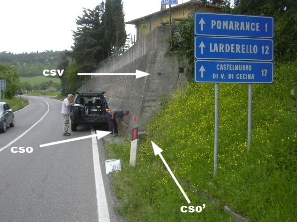[{"simbolo_contrassegno":"B1","materializzazione":"(CSO) – Bullone tipo IGM murato a 2m. dall'inizio del muro di sostegno lungo la SR 439."},{"simbolo_contrassegno":"B2","materializzazione":"(CSO') – Chiodo anonimo tipo CNR murato sul muretto del tombino."},{"simbolo_contrassegno":"V1","materializzazione":"(CSV) – Mensola murata sul fianco del muro di sostegno."}]