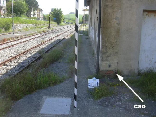 | Contrassegni | [{"simbolo_contrassegno":"B1","materializzazione":"(CSO) – Bullone tipo CNR infisso nel muro (spigolo sx) lato prospicente il fabbricato viaggiatori."},{"simbolo_contrassegno":"V1","materializzazione":"(CSV) – Mensola murata sulla facciata del fabbricato viaggiatori (lato saline)"}] |