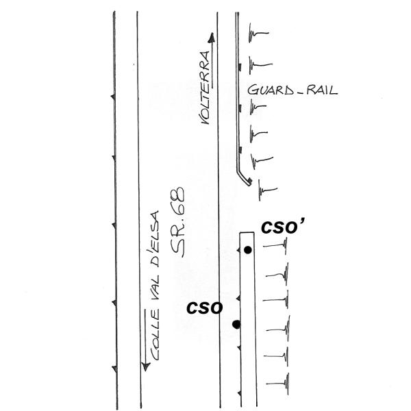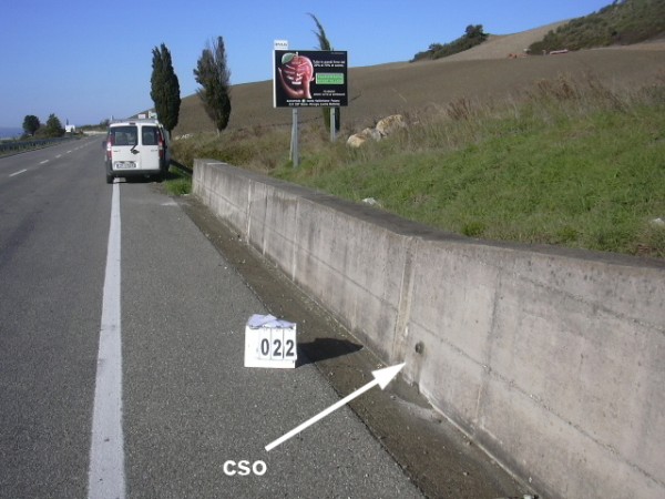 | Contrassegni | [{"simbolo_contrassegno":"B1","materializzazione":"(CSO) – Bullone infisso sul muro di sostegno in c.a. lato monte."},{"simbolo_contrassegno":"B4","materializzazione":"(CSO') – Centrino universale infisso sulla sommit\u00e0 del medesimo muro del cso."}] |