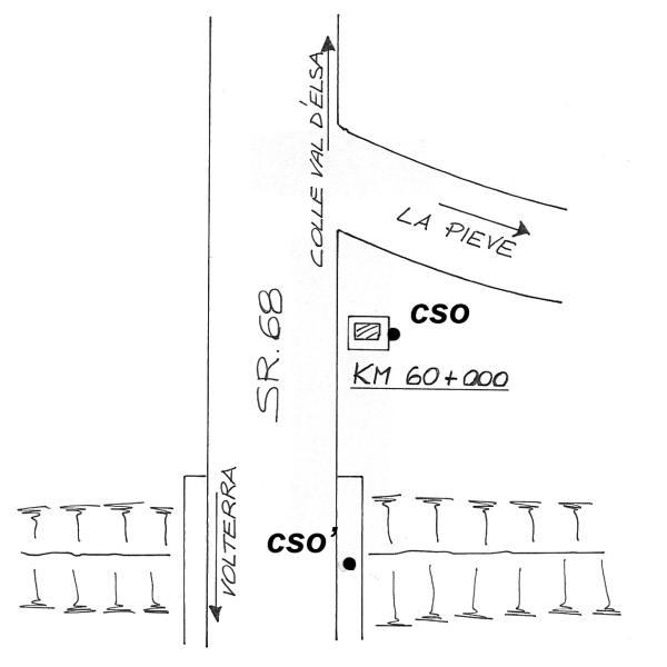 [{"simbolo_contrassegno":"B1","materializzazione":"(CSO) – Bullone infisso sul basamento in cemento della pietra chilometrica al km 60+000."},{"simbolo_contrassegno":"B4","materializzazione":"(CSO') – Centrino universale sulla spalletta del ponticello sul torrente \"I Fosci\"."}]