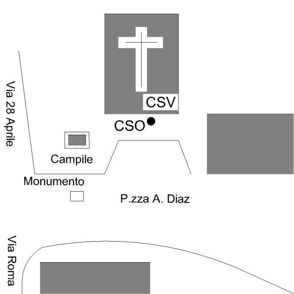 | Contrassegni | [{"simbolo_contrassegno":"P4","materializzazione":"(CSO) – Pozzetto alla base della facciata, nell'angolo con la prima lesena a destra della porta."},{"simbolo_contrassegno":"V2","materializzazione":"(CSV) – Piastrina nella facciata in corrispondenza del CSO."}] |
