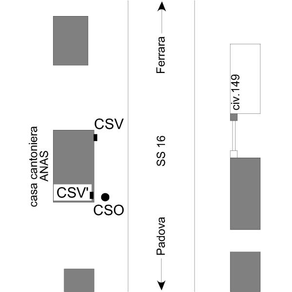 [{"simbolo_contrassegno":"B2","materializzazione":"(CSO) – Chiodo anonimo (bulloncino n\u00b011) sito sul marciapiede vicino allo spigolo sinistro del fabricato."},{"simbolo_contrassegno":"V2","materializzazione":"(CSV) – Piastrina a barilotto posizionato sulla facciata, spigolo destro."},{"simbolo_contrassegno":"V4","materializzazione":"(CSV') – Piastrina di altro Ente (magistrato del Po' Ferrara) posizionato sulla facciata, spigolo sinistro."}]