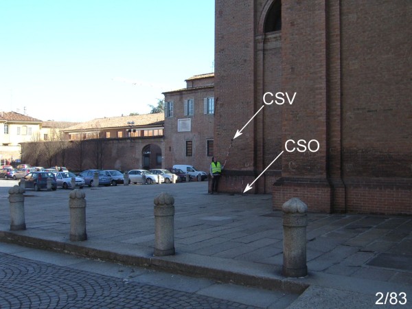 [{"simbolo_contrassegno":"P4","materializzazione":"(CSO) – Pozzetto in muratura contenente chiodo anonimo, interrato alla base della facciata laterale destra dell'avancorpo della chiesa, coperto con chiusino tondo in cemento, presso lo spigolo sinistro."},{"simbolo_contrassegno":"B6","materializzazione":"(CSO') – Centrino IGM95 di tipo \"B\" (associato) infisso sul parapetto del tunnel dell'uscita di sicurezza dell'ospedale pi\u00f9 ad Est."},{"simbolo_contrassegno":"V2","materializzazione":"(CSV) – Piastrina in ghisa infissa sulla stessa facciata della chiesa, in corrispondenza del CSO."}]