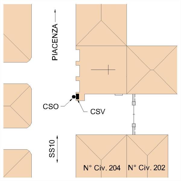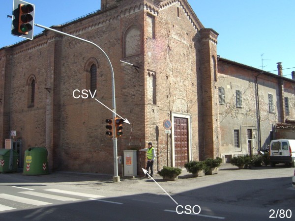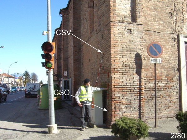 [{"simbolo_contrassegno":"B1","materializzazione":"(CSO) – Bullone infisso sul pilastro d'angolo a destra della Chiesa, lato volto verso la Statale."},{"simbolo_contrassegno":"V2","materializzazione":"(CSV) – Piastrina in ghisa infissa sullo stesso pilastro in corrispondenza del CSO."}]