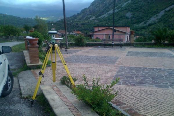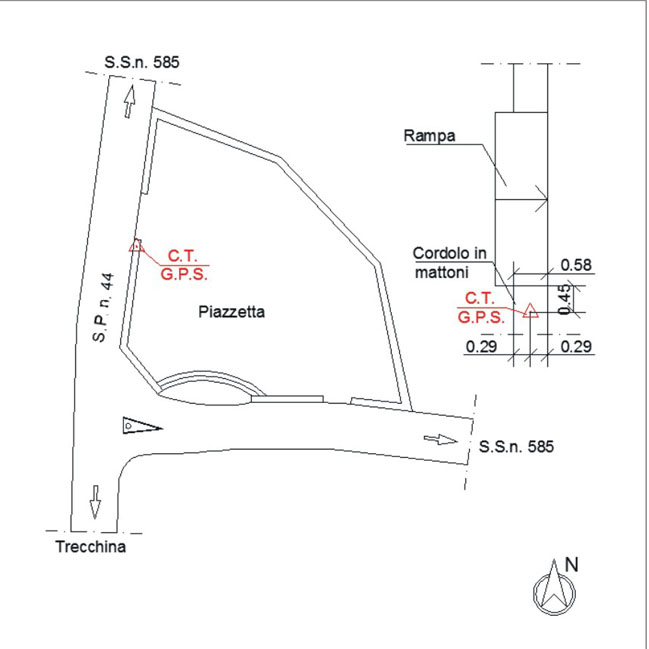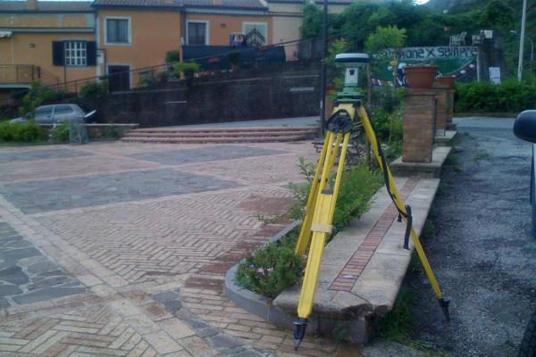 Centrino metallico orizzontale di tipo chiodo con rondella ARPAB Regione Basilicata infisso sulla sommità del cordolo in mattoni della piazzetta in località Parruta.