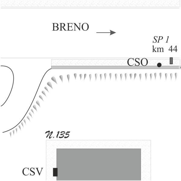 [{"simbolo_contrassegno":"B4","materializzazione":"(CSO) – Centrino universale (orizzontale) stabilizzato sul cordolo presso il km 44 della SP1."},{"simbolo_contrassegno":"V1","materializzazione":"(CSV) – Mensola stabilizzata sul fronte di destra, spigolo di sinistra, del fabbricato."}]