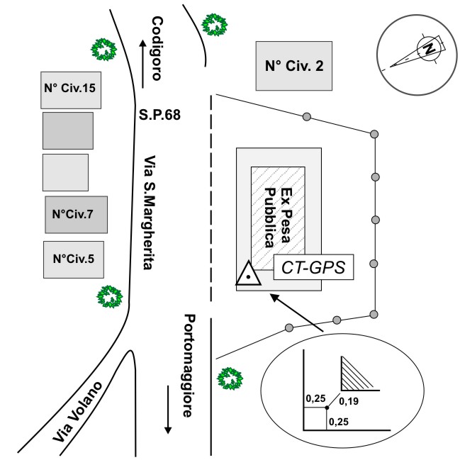 | materializzazione | Centrino in acciaio inox del tipo "GPS C" infisso nella cornice in cemento armato della ex pesa pubblica lato strada. |
