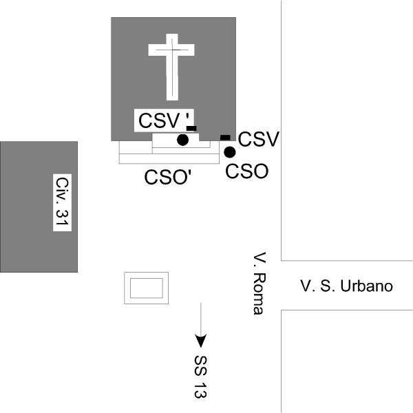 | Contrassegni | [{"simbolo_contrassegno":"P3","materializzazione":"(CSO) – Pozzetto in ghisa alla base della facciata, angolo di risega a destra."},{"simbolo_contrassegno":"V1","materializzazione":"(CSV) – Mensola sulla facciata in corrispondenza del CSO."},{"simbolo_contrassegno":"B3","materializzazione":"(CSO') – Circolo inciso sull'estremo destro della soglia della porta."},{"simbolo_contrassegno":"V3","materializzazione":"(CSV') – Piastrina antica sulla facciata a destra della porta suddetta."}] |
