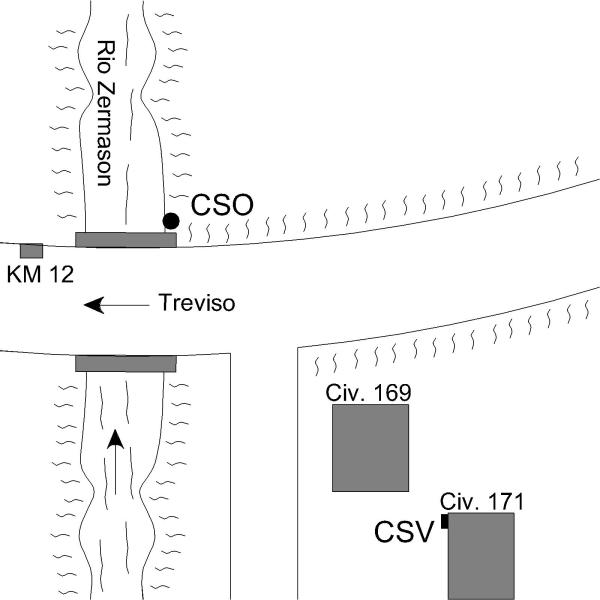 [{"simbolo_contrassegno":"B1","materializzazione":"(CSO) – Bullone infisso sulla spalletta destra del ponte andando a Treviso, dalla parte verso il Rio."},{"simbolo_contrassegno":"V5","materializzazione":"(CSV) – Targa con linea incisa (del catasto) sulla facciata della casa distante circa mt 80 dalla statale a sinistra andando verso Treviso."}]