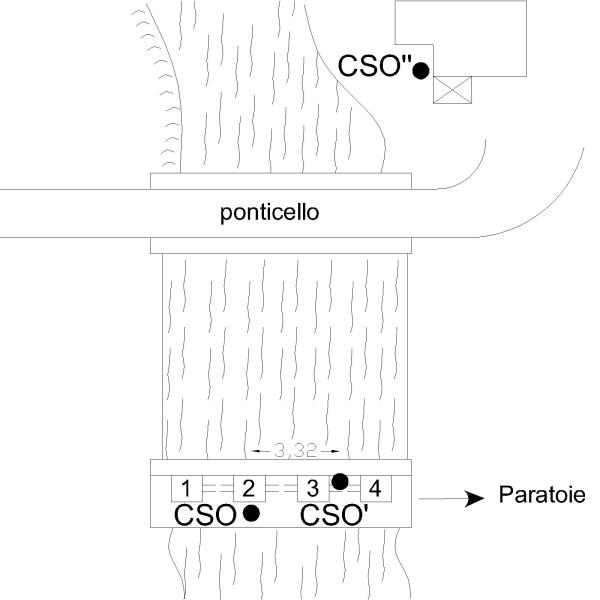 | Contrassegni | [{"simbolo_contrassegno":"B1","materializzazione":"(CSO) – Bullone infisso nella facciata opposta alla casa del blocco in CA utilizzato per sostenere il dispositivo delle paratoie."},{"simbolo_contrassegno":"B5","materializzazione":"(CSO') – Disco metallico impiombato infisso nella parte destra del blocco n 3 ad una distanza di 0,20 cm dalla facciata laterale del blocco e a 3,32 mt dal CSO."},{"simbolo_contrassegno":"B2","materializzazione":"(CSO'') – Chiodo anonimo infisso sul pavimento , nella risega prospicente al ponticelllo, presso lo spigolo destro."}] |