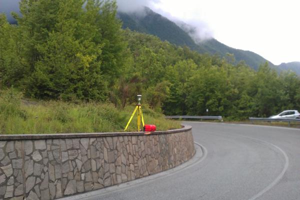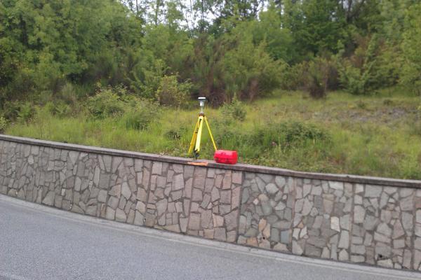 Centrino metallico orizzontale di tipo chiodo con rondella ARPAB Regione Basilicata infisso sulla sommità del muro di sostegno in C.L.S. della scarpata stradale.