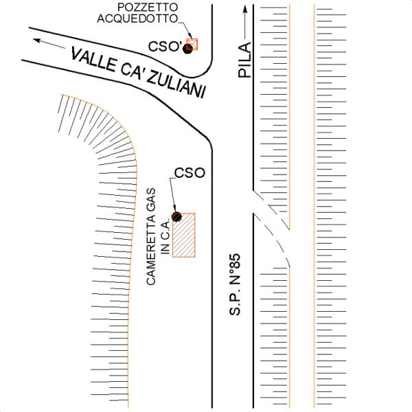 | Contrassegni | [{"simbolo_contrassegno":"B4","materializzazione":"(CSO) – CENTRINO UNIVERSALE (ORIZZONTALE) – in prossimita' dello spigolo di valle, in direzione Pila, della cameretta in c.a. del gasdotto Edison."},{"simbolo_contrassegno":"B2","materializzazione":"(CSO') – CHIODO ANONIMO – nel basamento del pozzetto acquedotto in prossimita' dello svincolo per Ca' Zuliani."}] |