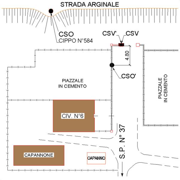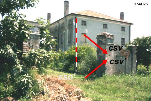 | Contrassegni | [{"simbolo_contrassegno":"B2","materializzazione":"(CSO) – CHIODO ANONIMO – sulla sommit\u00e0 del cippo n\u00b0 584, a sinistra della strada arginale nella direzione di Pila."},{"simbolo_contrassegno":"B2","materializzazione":"(CSO') – CHIODO ANONIMO – sul muretto di recinzione, a 4.80 m dalla colonna."},{"simbolo_contrassegno":"V5","materializzazione":"(CSV) – PIASTRINA DI ALTRO ENTE – (Consorzio Irriguo Rovigo) sulla colonna di sinistra, fronte argine."},{"simbolo_contrassegno":"V7","materializzazione":"(CSV') – CENTRINO UNIVERSALE (VERTICALE) – posto sotto il csv."}] |