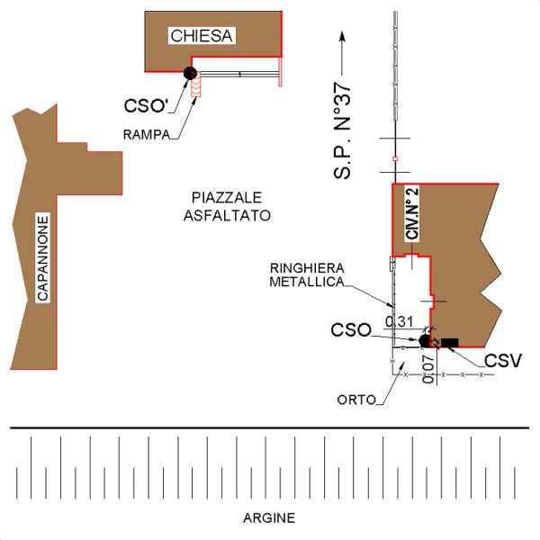 | Contrassegni | [{"simbolo_contrassegno":"B3","materializzazione":"(CSO) – CIRCOLO INCISO – sulla pavimentazione a sinistra della parete, fronte argine."},{"simbolo_contrassegno":"B2","materializzazione":"(CSO') – CHIODO ANONIMO – sulla sommit\u00e0 del muretto, posto alla sinistra della rampa di accesso alla chiesa."},{"simbolo_contrassegno":"V5","materializzazione":"(CSV) – PIASTRINA DI ALTRO ENTE – (CSL Calon Delta Padano) a sinistra sulla parete rivolta all'argine."}] |