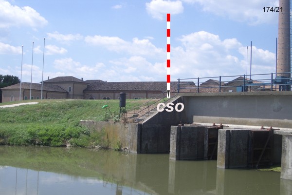 | Contrassegni | [{"simbolo_contrassegno":"B6","materializzazione":"(CSO) – CENTRINO – (AIPO) nell'angolo destro del primo gradino della scala sulla riva destra lato valle, della chiusa sul canale che conduce all'idrometro."},{"simbolo_contrassegno":"B2","materializzazione":"(CSO) – CHIODO ANONIMO – sulla risega a destra della porta di accesso all'edificio principale."},{"simbolo_contrassegno":"V2","materializzazione":"(CSV) – PIASTRINA A BARILOTTO – in corrispondenza del cso'."},{"simbolo_contrassegno":"V5","materializzazione":"(CSV') – TARGA CON LINEA INCISA – (Magistrato del Po) a sinistra della prima finestra dell'ala destra dell'edificio principale, fronte ingresso."}] |
