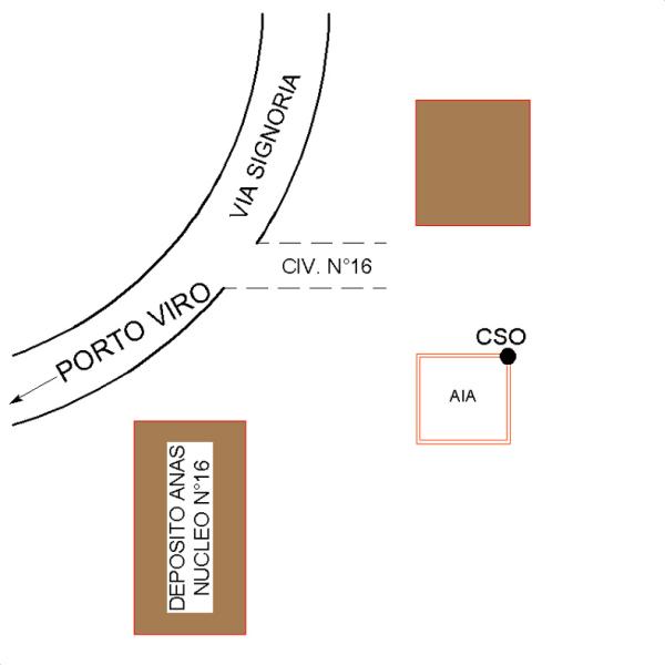 | Contrassegni | [{"simbolo_contrassegno":"B2","materializzazione":"(CSO) – CHIODO ANONIMO – sul cordolo dell'aia in c.a., spigolo Nord-Est. La casa colonica si trova adiacente al \" Pporto Viro – deposito ANAS – nucleo civico 16\"."}] |