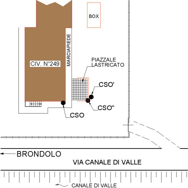 | Contrassegni | [{"simbolo_contrassegno":"P5","materializzazione":"(CSO) – POZZETTO – alla base della parete verso la strada, presso lo spigolo destro, interrato nel marciapiede, con coperchio in ferro."}] |