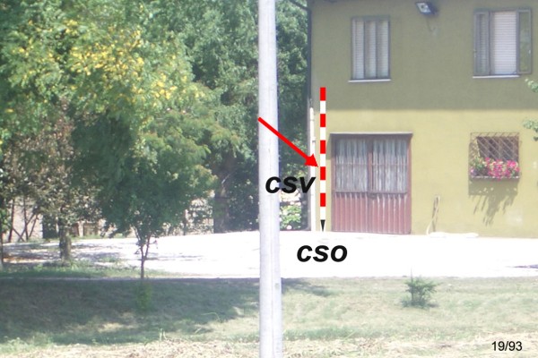 [{"simbolo_contrassegno":"B2","materializzazione":"(CSO) – CHIODO ANONIMO – (IRTA) alla base della facciata verso la strada, presso lo spigolo sinistro, in prossimita' della porta dell'autorimessa."},{"simbolo_contrassegno":"V5","materializzazione":"(CSV) – TARGA CON LINEA INCISA – (IRTA) sulla facciata in corrispondenza del cso."}]
