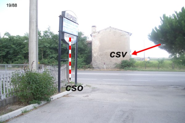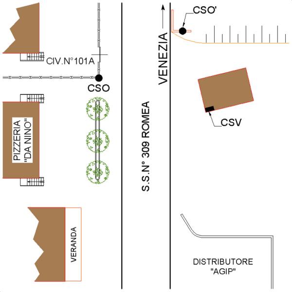 | Contrassegni | [{"simbolo_contrassegno":"B1","materializzazione":"(CSO) – BULLONE – nel muro di recinzione del civico 101, all'estrema sinistra, verso il parcheggio antistante la pizzeria \"da Nino\"."},{"simbolo_contrassegno":"B2","materializzazione":"(CSO') – CHIODO ANONIMO – (Regione Veneto) sulla sommita' della spalletta del ponticello sopra il fossato al km 75 + 130, spigolo verso Ravenna, lato strada."},{"simbolo_contrassegno":"V5","materializzazione":"(CSV) – TARGA CON LINEA INCISA – (Catasto) sulla facciata perpendicolare alla SS 309, rivolta verso Ravenna vicino allo spigolo sinistro."}] |