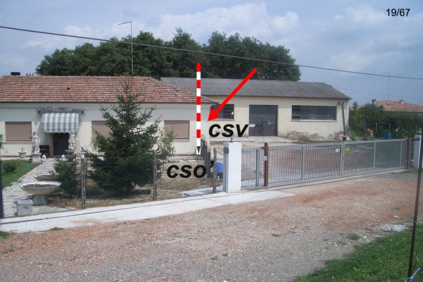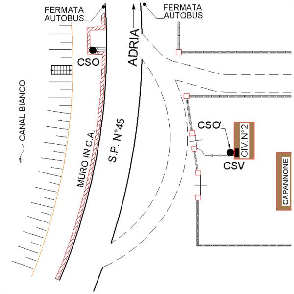 [{"simbolo_contrassegno":"B7","materializzazione":"(CSO) – Centrino del tipo di superficie della Direzione Generale del Catasto, infisso sul terzo gradino pi\u00f9 alto dei tre esistenti sul margine destro della strada che permettono di salire sull'argine del Canal Bianco."},{"simbolo_contrassegno":"B1","materializzazione":"(CSO') – BULLONE – sulla facciata presso lo spigolo destro vicino al canaletto."},{"simbolo_contrassegno":"V5","materializzazione":"(CSV) – TARGA CON LINEA INCISA – (Catasto) sulla facciata in corrispondenza del cso."}]