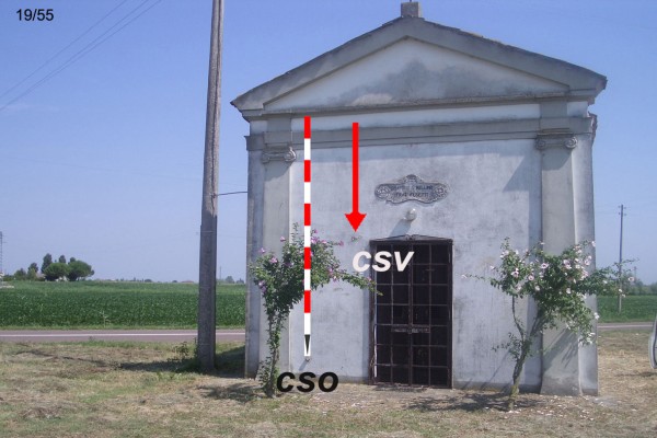 [{"simbolo_contrassegno":"B1","materializzazione":"(CSO) – BULLONE – alla base della facciata, a sinistra della porta d'ingresso."},{"simbolo_contrassegno":"V2","materializzazione":"(CSV) – PIASTRINA A BARILOTTO – sulla facciata in cortrispondenza del cso."}]