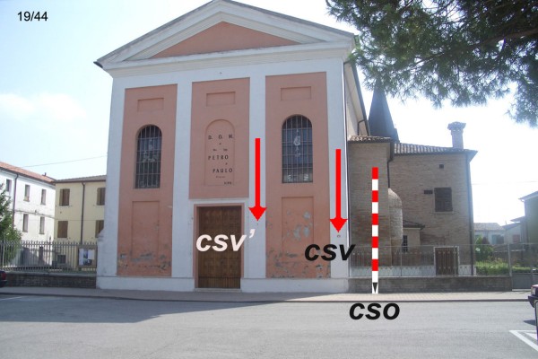 | Contrassegni | [{"simbolo_contrassegno":"P3","materializzazione":"(CSO) – CHIUSINO IN GHISA – alla base della facciata destra, a 0.90 m dallo spigolo destro, protetto da chiusino con pavimentazione."},{"simbolo_contrassegno":"V2","materializzazione":"(CSV) – PIASTRINA A BARILOTTO – sulla facciata principale in corrispondenza del cso."},{"simbolo_contrassegno":"V3","materializzazione":"(CSV') – PIASTRINA ANTICA – sulla facciata principale a destra della porta d'ingresso."}] |